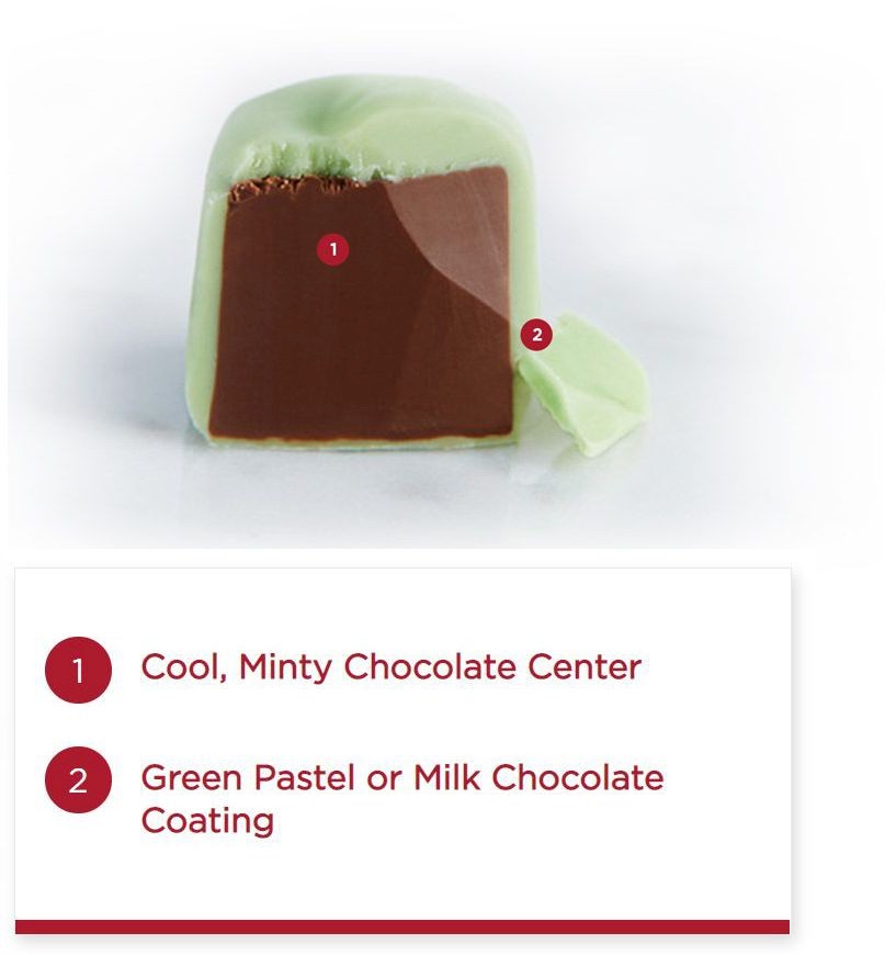 WARM WEATHER WARNING: (see product details) The quintessential Fannie May® favorite. These mouth watering mints stole hearts when they were introduced in 1963. With a mint chocolate center and a beautiful green or milk chocolate coating, these confections are the perfect indulgence, no matter the occasion! Gluten free. 8 oz. Box (½ pound) -
